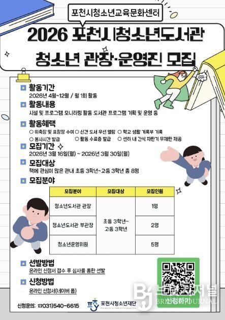 브릿지저널 김경미 기자 | 포천시청소년재단 포천시청소년교육문화센터는 청소년 참여형 도서관 운영을 위해 ‘2026년 포천시청소년도서관 청소년 관장 및 운영진’을 모집한다.