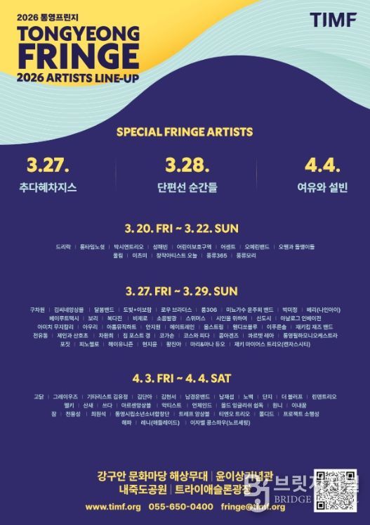 브릿지저널 김경미 기자 | 통영시는 오는 3월 20일부터 4월 4일까지 통영시 일원에서 개최되는 '2026 통영프린지'의 개막을 앞두고, 축제에 참여하는 주요 라인업과 공간별 관람 포인트를 공개했다.