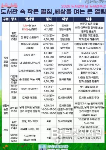 도서관 관계자는 “이번 행사는 책을 매개로 환경과 과학, 그리고 타인에 대한 이해까지 넓힐 수 있도록 기획했다”며 “시민들이 도서관 곳곳을 즐기며 새로운 매력을 발견하는 시간이 되길 기대한다”고 밝혔다.