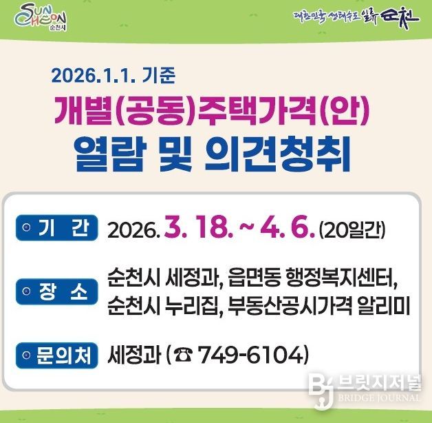 브릿지저널 김경미 기자 | 순천시는 1월 1일 기준 개별(공동)주택 가격 열람 및 의견제출 기간을 3월 18일부터 4월 6일까지 운영한다고 밝혔다.
