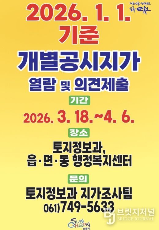 브릿지저널 김경미 기자 | 순천시는 2026년 1월 1일 기준 개별공시지가의 열람 및 의견제출을 3월 18일부터 4월 6일까지 접수한다고 밝혔다.