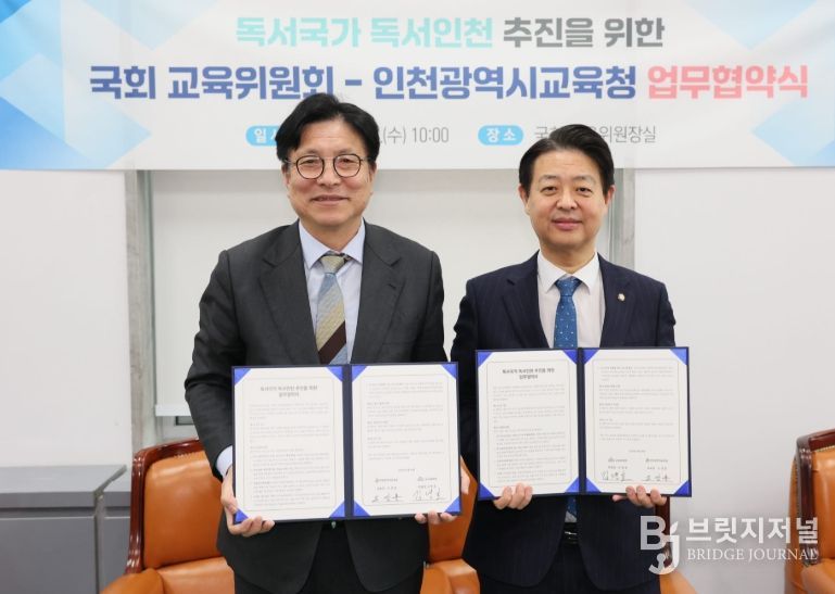 브릿지저널 김경미 기자 | 인천광역시교육청은 18일 도성훈 교육감과 김영호 교육위원장을 비롯해 양측 관계자들이 참석한 가운데, 국회 교육위원회와 ‘독서국가 독서인천’ 추진을 위한 업무협약을 체결했다.
