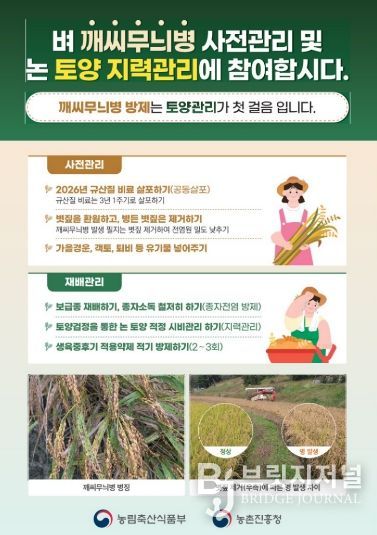 특히 지난해 등숙기 동안 피해가 컸던 깨씨무늬병 예방을 위해서는 종자와 토양 관리를 철저히 해야 한다. 종자는 소금물가리기를 통해 충실한 볍씨를 선별하고, 소독은 약 30℃ 물에서 24~28시간 약제 소독하거나 60℃ 물에서 10분간 처리하는 온탕 소독 방법이 권장된다.