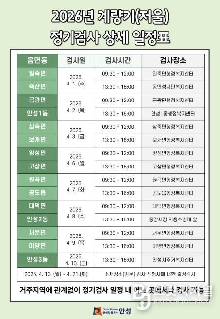 정기검사는 4월 1일부터 10일까지 읍·면·동 순회검사 방식으로 진행되며 검사 장소는 각 행정복지센터를 비롯해 안성시 주거복지센터와 안성중앙시장 등이다.