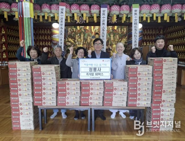 브릿지저널 김경미 기자 | 가평 청룡사는 최근 지역의 소외된 이웃들에게 도움이 되길 바라는 마음으로 청평면 행정복지센터에 즉석밥 60박스를 기탁했다.