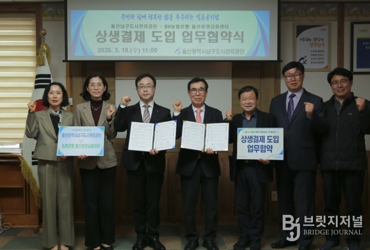 브릿지저널 윤나영 기자 | 울산남구도시관리공단은 18일 농협은행 울산중앙금융센터와 중소기업 상생환경 조성을 위해 상생결제 시스템 도입과 확산을 위한 업무협약을 체결했다.