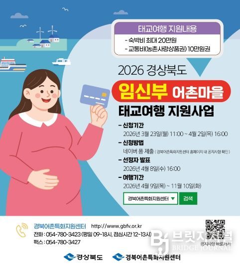 브릿지저널 정보영 기자 | 경상북도는 저출생 문제를 해결하고 어촌지역 활성화를 위하여 3월 23일부터‘임신부 어촌마을 태교여행’모집을 실시한다고 밝혔다.