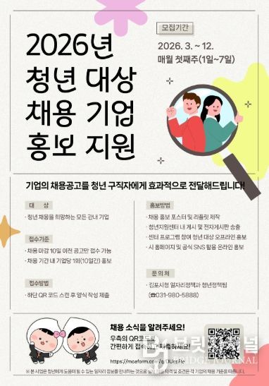 브릿지저널 김경미 기자 | 김포시는 지역 청년들의 취업 기회를 확대하고 관내 기업의 인력난 해소를 위해 ‘청년 맞춤형 채용정보 지원사업’을 추진한다고 밝혔다.