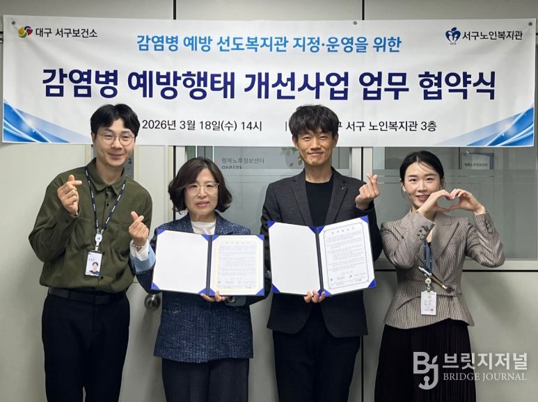 브릿지저널 김진석 기자 | 대구 서구보건소는 18일, 서구노인복지관(사회복지법인 가정복지회)을 ‘감염병 예방 선도복지관’으로 지정하고, 원활한 운영을 위한 업무협약을 체결했다.