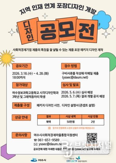 브릿지저널 김경미 기자 | 여수시는 관내 사회적경제기업 제품의 브랜드 경쟁력 강화를 위해 ‘지역 인재 연계 포장디자인 개발 공모전’을 본격 추진한다고 밝혔다.