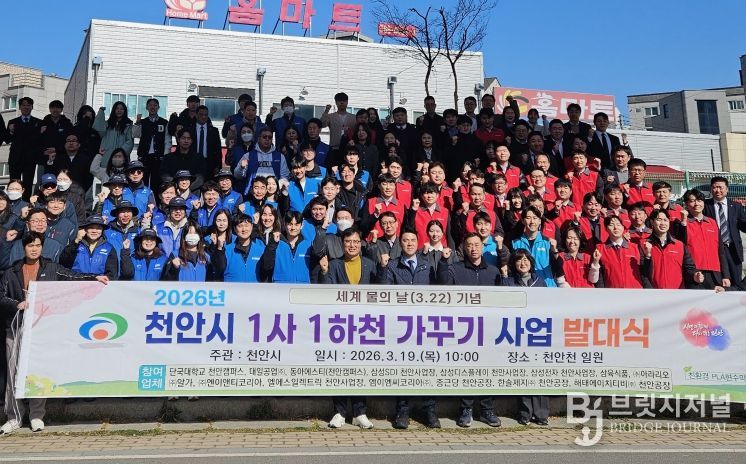브릿지저널 정보영 기자 | 천안시는 세계 물의 날(3월 22일)을 기념해 19일 천안천 일원에서 ‘2026년 1사 1하천 가꾸기 사업’ 발대식을 개최하고 하천 정화활동을 진행했다.