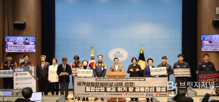 브릿지저널 김경미 기자 | 국민의힘 이상휘 의원(포항 남·울릉)은 19일 국회 정론관에서 포스코·현대제철의 한국노총과 민주노총 소속 노동자들과 함께 ‘대한민국 철강산업 위기 극복을 위한 공동 기자회견’을 열었다.