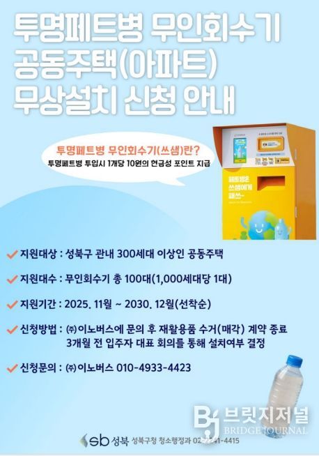 브릿지저널 김경미 기자 | 서울 성북구가 주민의 투명페트병 분리배출 편의를 높이기 위해 무인회수기 확대에 나섰다.