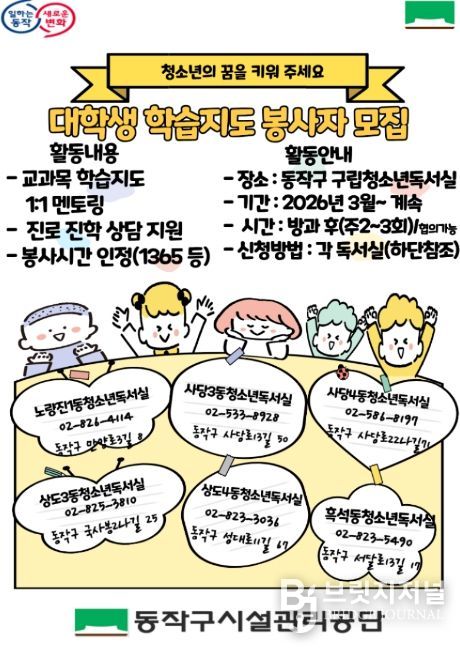 한편, 구는 ▲서울대 사범대생과의 1:1 수학 멘토링 ▲중고등학생 대상 수학여행 경비 지원 ▲동작 우주캠프 운영 등 관내 청소년을 위한 지원사업을 다각적으로 추진하고 있다.