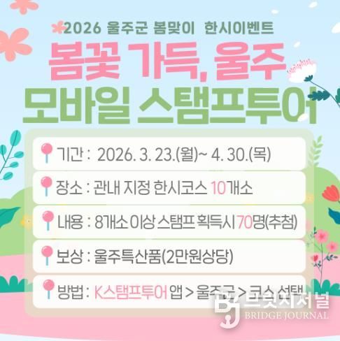 올해 새롭게 리뉴얼된 K스탬프투어 모바일 앱을 이용한 ‘봄꽃 가득, 울주’ 이벤트와 ‘울주와봄’ SNS 여행후기 인증 이벤트 등으로 구성됐다.