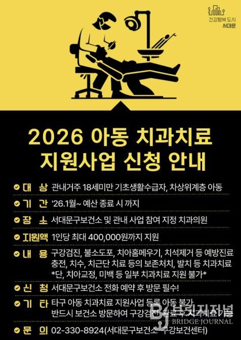 브릿지저널 김경미 기자 | 서대문구가 취약계층 아동의 구강건강을 위해 ‘아동 치과 치료 지원사업’을 확대 추진한다고 20일 밝혔다.