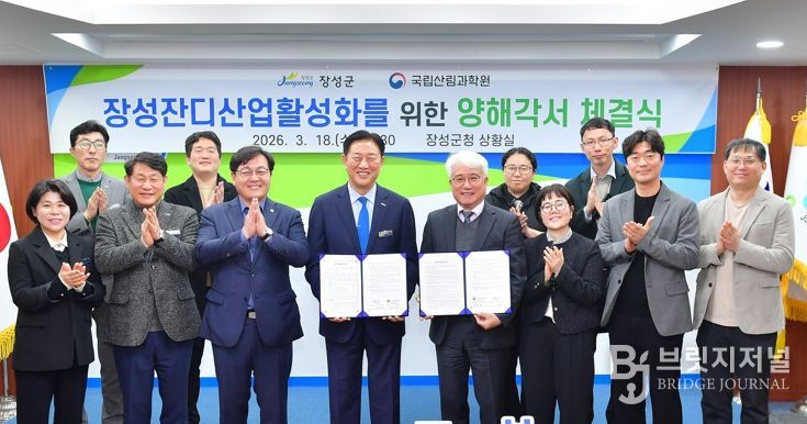 브릿지저널 김경미 기자 | 장성군과 국립산림과학원이 18일 군청 상황실에서 잔디산업 활성화를 위한 업무협약을 체결했다. 협약식에는 김한종 장성군수, 권순덕 국립산림과학원 산림바이오소재연구소연구소장 등 관계자 10여 명이 참석했다.
