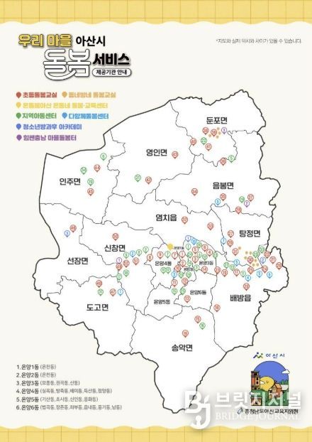 영유아 돌봄은 권역별 ‘365×24 어린이집’을 중심으로 운영된다. 생후 6개월부터 취학 전까지를 대상으로 평일 야간과 새벽, 주말 및 공휴일에도 보육 서비스를 제공한다. 이용료는 시간당 2,000원이다. 현재 배방읍과 온양3동 등 2개소가 운영 중이며, 상반기 중 음봉면과 둔포면에 2개소가 추가로 문을 열 예정이다.