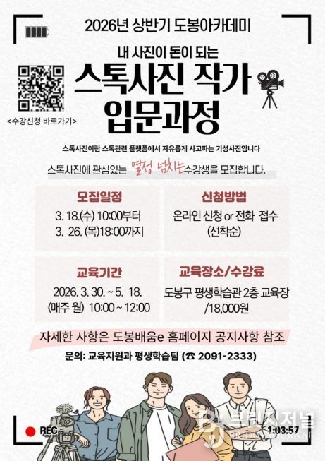 브릿지저널 김경미 기자 | 서울 도봉구가 오는 3월 30일부터 5월 18일까지 매주 월요일 도봉구 평생학습관 2층 대강의실에서 ‘스톡사진 작가 입문과정’을 운영한다고 밝혔다.