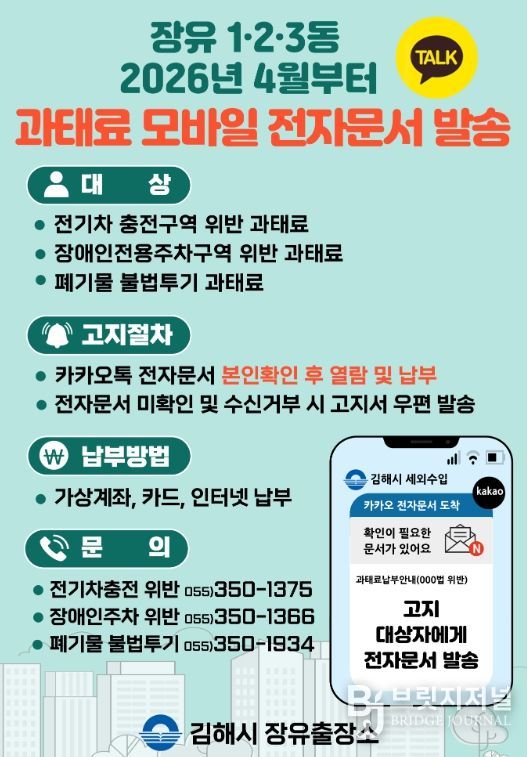 브릿지저널 김경미 기자 | 김해시 장유출장소는 오는 4월 1일부터 과태료 고지서 모바일 전자문서 발송 서비스를 도입한다고 23일 밝혔다.