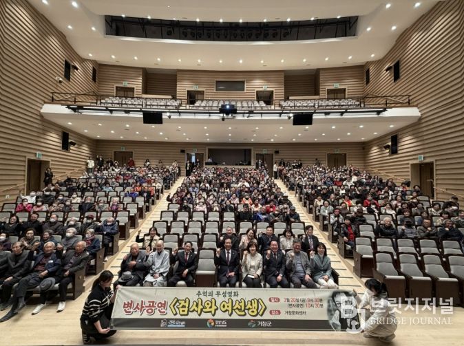 브릿지저널 김경미 기자 | 거창군은 지난 20일, 거창문화센터 공연장에서 거창군 삶의 쉼터 주관으로 어르신 400여 명을 모시고 개최한 무성영화 변사극 ‘검사와 여선생’ 공연이 성황리에 마무리됐다고 밝혔다.