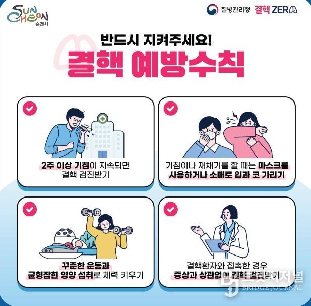 브릿지저널 김경미 기자 | 순천시보건소가 오는 24일 제16회 ‘결핵 예방의 날’을 맞아 시민들에게 결핵 조기 발견과 전파 차단을 위한 정기 검진의 중요성을 알리기 위한 홍보캠페인을 실시한다고 20일 밝혔다.