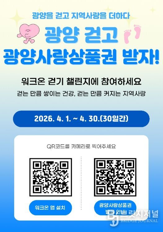브릿지저널 김경미 기자 | 광양시가 오는 4월부터 시민 건강 증진과 지역경제 활성화를 위해 모바일 걷기 앱 ‘워크온’ 걷기 챌린지 보상을 기존 모바일 상품권에서 광양사랑상품권으로 변경해 지급한다고 밝혔다.