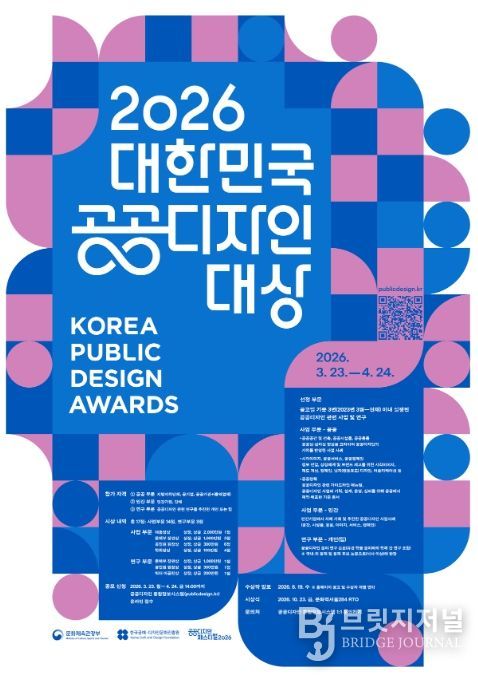 브릿지저널 김경미 기자 | 문화체육관광부는 한국공예‧디자인문화진흥원과 함께 3월 23일부터 4월 24일까지 ‘2026 대한민국 공공디자인대상’을 공모한다. 19회를 맞이한 이번 공모에서는 공공디자인을 통해 국민의 일상을 아름답고 편리하게 조성하는 데 기여한 우수사업과 연구 총 17점을 선정한다.