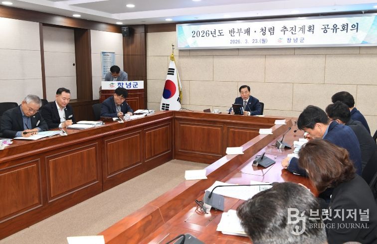 브릿지저널 김경미 기자 | 창녕군은 23일, 2025년 종합청렴도 1등급 달성 성과를 이어가기 위해 군수를 비롯한 부군수, 간부공무원 등 40여 명이 참석한 가운데 2026년 반부패‧청렴 추진계획 공유 회의를 개최했다.