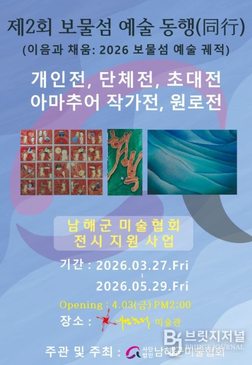 브릿지저널 김경미 기자 | (사)남해군미술협회는 오는 3월 27일부터 5월 29일까지 바람흔적 미술관에서 지역 예술인들의 창작 활동을 지원하고 군민들에게 풍성한 볼거리를 제공하기 위해 ‘제2회 보물섬 예술 동행’ 전시 지원사업을 개최한다.