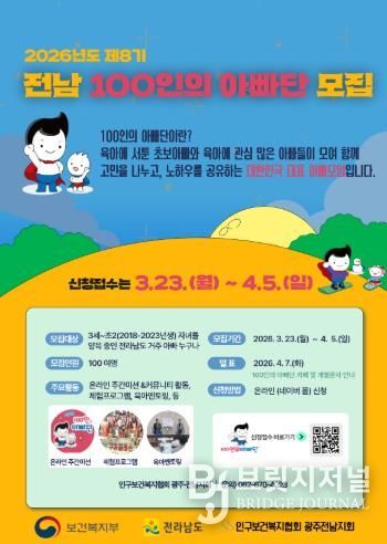 브릿지저널 김경미 기자 | 전라남도는 아빠의 육아 참여를 확대하고 가족 중심의 건강한 양육문화를 확산하기 위해 2026년 제8기 전남 100인의 아빠단 참여자를 모집한다.