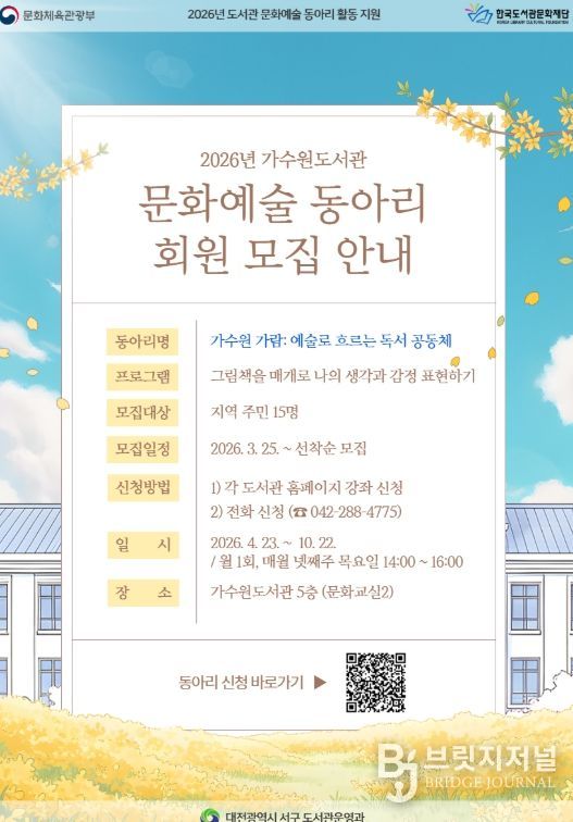 브릿지저널 정보영 기자 | 대전 서구 가수원도서관은 ‘2026년 도서관 문화예술 동아리 활동 지원사업’의 일환으로, 그림책 심리·정서 프로그램 신규 회원을 모집한다고 24일 밝혔다.