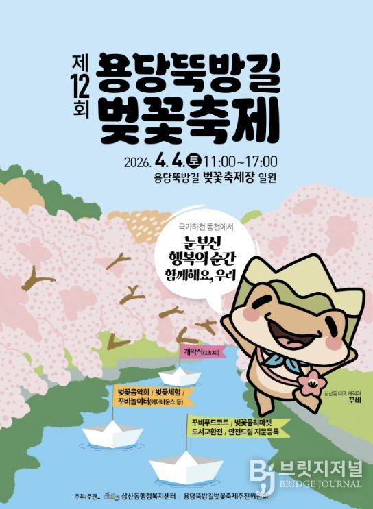 브릿지저널 김경미 기자 | 순천시 삼산동행정복지센터는 4월 4일 동천 벚꽃길 일대(용당동 705)에서 ‘국가하천 동천에서 눈부신 행복의 순간 함께해요, 우리’라는 주제로 제12회 용당뚝방길 벚꽃축제를 개최한다고 밝혔다.