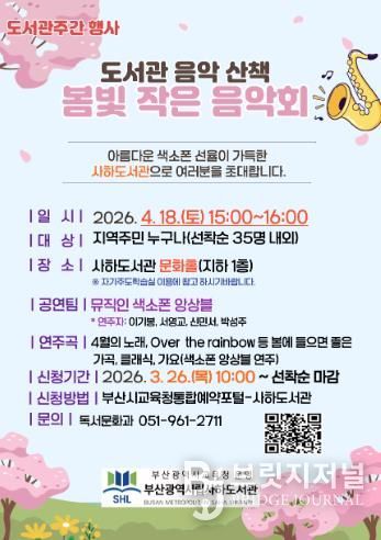 김정남 사하도서관장은 “이번 공연이 아름다운 악기의 선율과 함께 봄을 느낄 수 있는 시간이 되길 바란다”며 “앞으로도 시민들이 함께 즐길 수 있는 다양한 문화 프로그램을 지속적으로 운영하겠다”고 말했다.