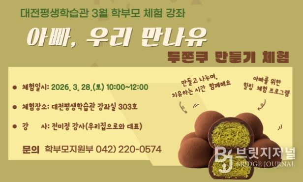 브릿지저널 정보영 기자 | 대전시교육청 평생학습관은 아버지 학부모의 적극적인 참여와 역할 강화를 위한 마중물로 힐링 체험 프로그램인 ‘두바이쫀득쿠키만들기’ 요리 강좌를 3월 28일 오전에 운영한다고 밝혔다.