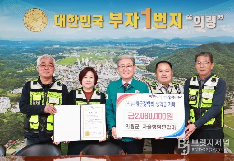 브릿지저널 김경미 기자 | 의령군은 지난 23일 의령군 자율방범연합대(회장 강철석)가 지역 인재 양성을 위해 (사)의령군장학회에 장학금 208만원을 기탁했다고 밝혔다.