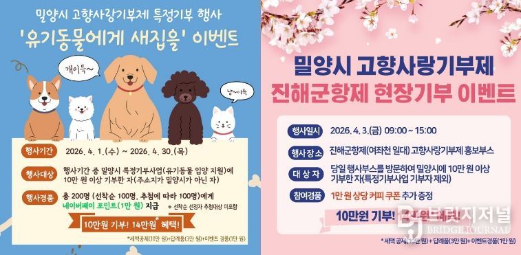 참여 방법은 고향사랑e음 누리집에 접속해 ‘특정사업 기부하기’ 메뉴에서 경상남도 밀양시 ‘유기동물 입양 지원사업’을 선택해 기부하면 자동으로 응모된다. 당첨자는 5월 8일까지 개별 안내될 예정이다.