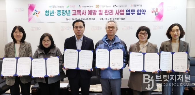 브릿지저널 정보영 기자 | 대전 동구는 25일 구청 접견실에서 사회적 고립 위험에 놓인 청년‧중장년의 고독사 예방과 정서적 안정 지원을 위해 지역 내 5개 수행기관과 업무협약을 체결했다고 밝혔다.