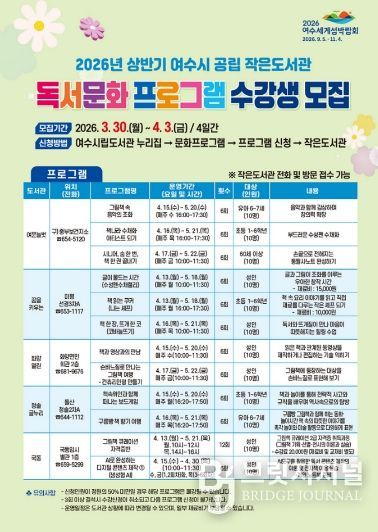 브릿지저널 김경미 기자 | 여수시는 오는 3월 30일부터 4월 3일까지 공립 작은도서관 ‘2026년 상반기 독서문화 프로그램’ 수강생을 모집한다고 밝혔다.