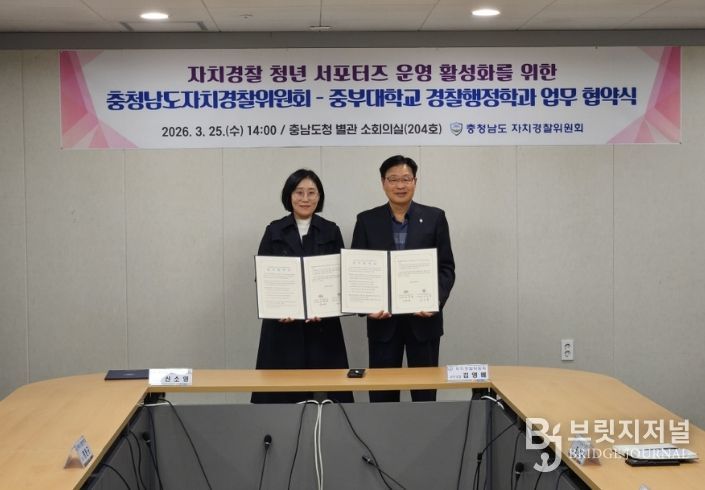 브릿지저널 정보영 기자 | 충남도 자치경찰위원회는 25일 도청 별관 소회의실에서 중부대 경찰행정학과와 ‘자치경찰 청년 서포터즈 운영 활성화를 위한 업무협약’을 체결했다.