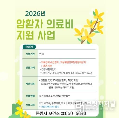 브릿지저널 김경미 기자 | 통영시는 저소득층 성인, 소아 암환자들의 의료비 부담 경감을 위한 ‘암환자 의료비 지원사업’을 추진하고 있다고 26일 밝혔다.