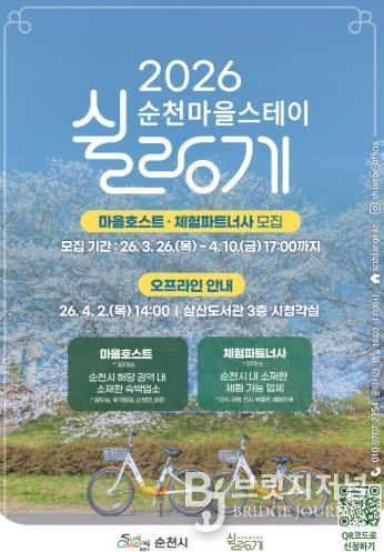 브릿지저널 김경미 기자 | 순천시는 '2026 순천마을스테이 쉴랑게 V2.0'에 참여할 마을 호스트와 체험파트너사를 오는 4월 10일까지 모집한다고 밝혔다.