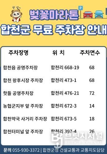 주차장 무료개방과 관련한 자세한 사항은 합천군 건설교통과 교통지도담당으로 문의하면 된다.