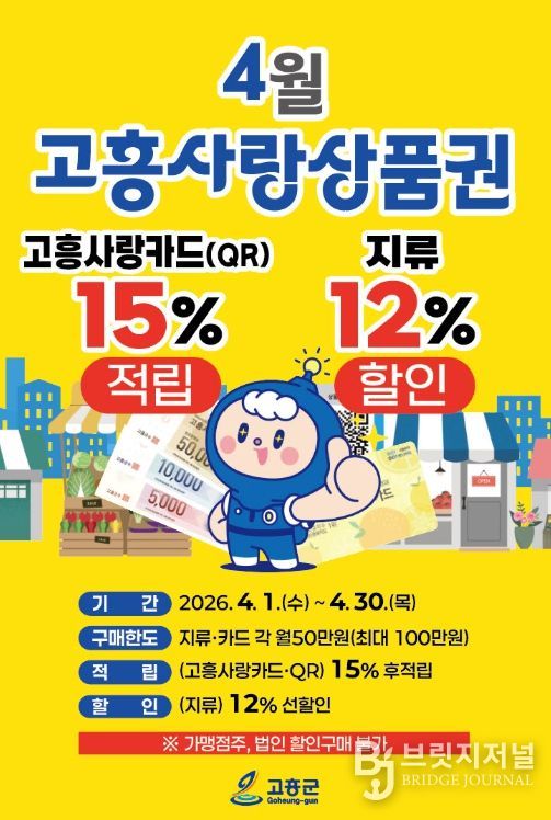브릿지저널 김경미 기자 | 고흥군은 지난 1월부터 3월까지 진행한 고흥사랑상품권 특별할인 행사의 뜨거운 성원에 힘입어, 오는 4월 1일부터 한 달간 고흥사랑상품권 할인 혜택을 연장 운영하며 민생경제에 온기를 더한다.