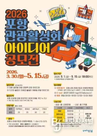 포항시 관계자는 “이번 공모전을 통해 다양한 시각을 정책에 반영할 수 있을 것으로 기대한다”며, “참신하고 실현 가능한 아이디어 발굴을 통해 포항 관광이 한 단계 도약할 수 있도록 많은 관심과 참여를 바란다”고 말했다.