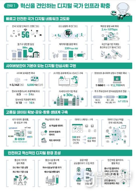 (①디지털 기반 시설'인프라' 확충) 전국 5세대 이동통신망을 단독 모드(SA)로 전환하는 등 5세대 이동통신을 고도화하고, 차세대 6세대 이동통신 상용화 기술을 개발하여 2030년 6세대 이동통신 상용화를 추진하는 등 국가 디지털 연결망(네트워크)을 고도화해 나갈 계획이다. 또한, 정보 보호 관리체계를 강화하고 공공‧민간 사이버보안 역량 강화를 위한 제도개선을 추진하는 등 사이버 위협으로부터 안전한 디지털 안심 사회를 구현하는 한편, 국가 데이터 통합 온라인 체제 기반(플랫폼)을 구축하는 등 고품질 데이터 생태계를 조성한다.
