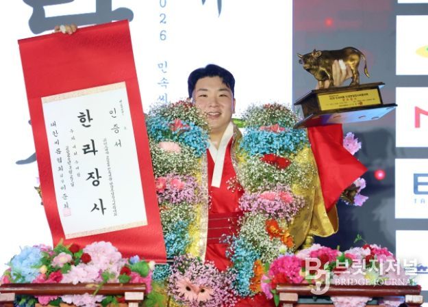 브릿지저널 윤나영 기자 | 울주군 해뜨미씨름단 소속 김무호(23) 선수가 지난 27일 충청북도 단양군 단양체육관 동관에서 열린 ‘위더스제약 2026 민속씨름 단양온달장사씨름대회’에서 한라장사에 등극했다.