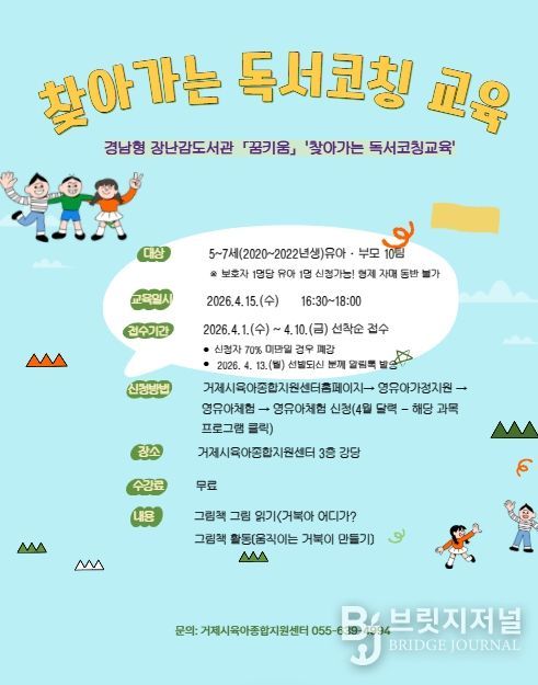 브릿지저널 김경미 기자 | 거제시육아종합지원센터는 오는 4월 15일, 거제시 관내 5~7세 영유아 자녀를 둔 가정을 대상으로 ‘찾아가는 독서코칭 교육’을 실시한다.