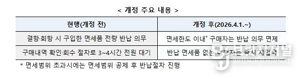 관세청은 지난 2월 말 면세품 회수 예외 근거가 「관세법 시행령」에 마련됨에 따라, 세부 이행 절차를 담은 「여행자 및 승무원 휴대품 통관에 관한 고시」 개정을 완료하고 4월 1일부터 본격 시행한다고 밝혔다.