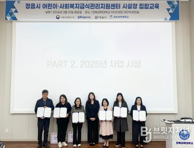 브릿지저널 윤나영 기자 | 정읍시 어린이·사회복지급식관리지원센터가 지난달 31일 전북과학대학교 하이브(HIVE)센터에서 관내 어린이 급식소 시설장 90여 명을 대상으로 ‘2026년 사업설명회 및 어린이 식생활 교육’을 개최했다.